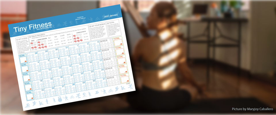 Tiny Fitness tracker sheet for January/2021. Check out www.tinyfitness.org for information on how to use and change your behavior towards a healthier active lifestyle.